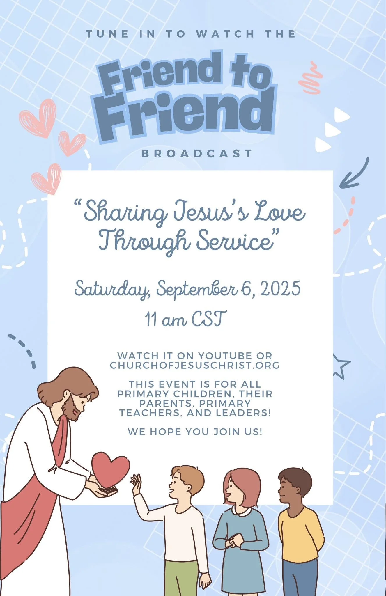 Hosted by the Primary General Presidency, the broadcast titled “Sharing Jesus’ Love Through Service” will feature what children from the Philippines, New Zealand, Texas, Mexico and Alabama have done to follow Jesus Christ through service.